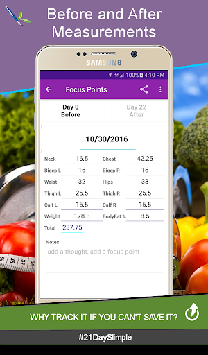 21 Day Slimple - The Easy Fix offers numerous benefits such as customizable workout schedules detailed nutrition tracking and robust reporting tools. The app excels in providing users with multiple ways to monitor their progress including weight tracking measurement comparisons and photo documentation. However there are some drawbacks to consider. For one the app might feel overwhelming for beginners due to its extensive feature set. Additionally while it offers a free trial period some users may find the lack of in-app purchases limiting if they desire additional features. Overall 21 Day Slimple is a powerful resource for individuals dedicated to transforming their health over a 21-day cycle. Its comprehensive tracking capabilities and personalized options make it a top choice for fitness enthusiasts