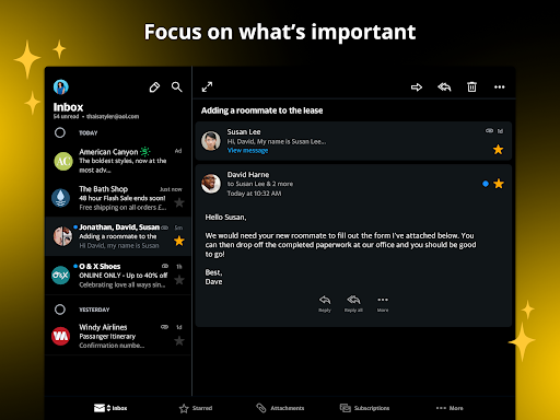 The AOL App stands out with its diverse range of features designed to enhance productivity and streamline digital tasks. Here are five key highlights: 1. All-in-One Solution - Combines email, news, and weather updates in a single platform, eliminating the need for multiple apps and streamlining daily digital activities. 2. Advanced Email Management - Offers 1 TB of storage, attachment previews, auto-sorting for gift cards and coupons, and easy unsubscribe options, making email management more efficient than ever. 3. Comprehensive News Aggregation - Provides breaking news and in-depth coverage across various topics from trusted sources like CNN, BBC, and Reuters, offering diverse perspectives beyond single-source news apps. 4. Intuitive Content Saving - Allows users to save articles for later reading with a simple tap, ensuring important information is always accessible when needed. 5. Real-Time Weather Updates - Delivers local and global forecasts with clear hourly and daily views, plus customizable notifications for timely weather alerts, helping users plan their day effectively.