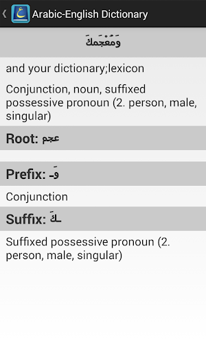 Arabic English Dictionary is packed with useful features that enhance the translation experience Here are five key highlights 1 Morphological Analysis - The app handles complex Arabic word structures including prefixes and suffixes providing accurate translations even for challenging word forms 2 Vocabulary Depth - With over 80000 stems in its database the dictionary offers extensive coverage of Modern Standard Arabic vocabulary 3 Linguistic Details - Each entry includes part of speech and root information helping users understand word usage and connections 4 Media Integration - The app's media friendly design allows users to easily copy and paste Arabic text into documents and digital platforms 5 Educational Value - The detailed linguistic information makes it an ideal tool for Arabic language learners at various proficiency levels