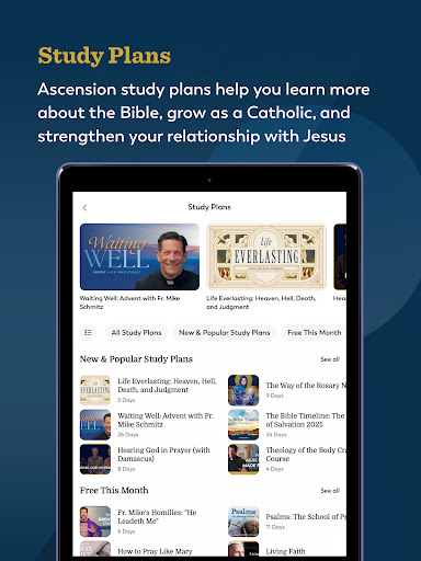 Ascension is a comprehensive Catholic Bible application designed to help users deepen their understanding of the Bible and Catholic teachings. This app features the popular Great Adventure Catholic Bible with the unique Bible Timeline learning system, enabling users to finally read and comprehend God's Word effectively. Available on mobile platforms, Ascension offers various spiritual resources including daily Mass readings, reflections, study plans, and podcasts. One notable feature is the special Advent study series led by Fr. Mike Schmitz, which provides daily video reflections throughout the Advent season. Users can also pray the Rosary with guidance from trusted Catholic figures in both English and Latin. The app provides access to over 80 study plans by leading Catholic presenters, enhancing users' biblical knowledge and spiritual growth. Overall, Ascension serves as an invaluable tool for Catholics seeking to enrich their faith and engage more fully with the Church's teachings and traditions.