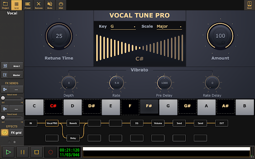 Audio Evolution Mobile Studio stands out as a feature-rich music production app. Here are five notable characteristics: 1. Multitrack Recording and Editing - Users can record unlimited audio and MIDI tracks with precise editing tools including tempo changes and time-stretching. 2. Vocal Processing Tools - The app includes Vocal Tune Studio for pitch correction and time alignment of vocal recordings, plus formant control and vibrato adjustments. 3. Virtual Instruments - Featuring Evolution One synthesizer and sample-based Soundfont instruments for creating rich instrumental sounds. 4. Real-Time Effects Processing - Apply various effects such as EQ, reverb, compression, and more with flexible routing options and parameter automation. 5. Cloud Integration - Sync projects with Google Drive for backup, sharing, and collaboration across multiple devices, enhancing workflow flexibility.