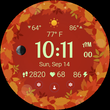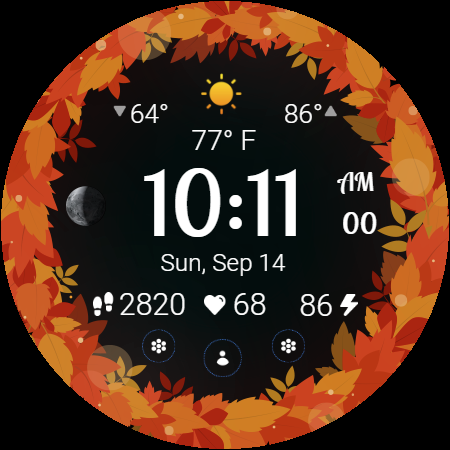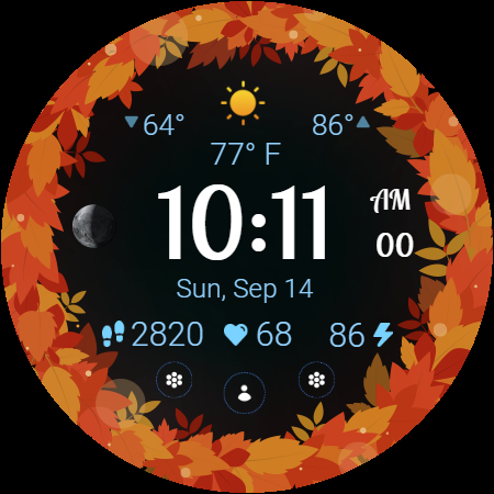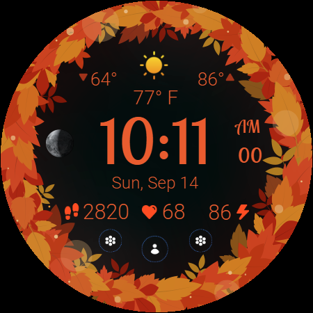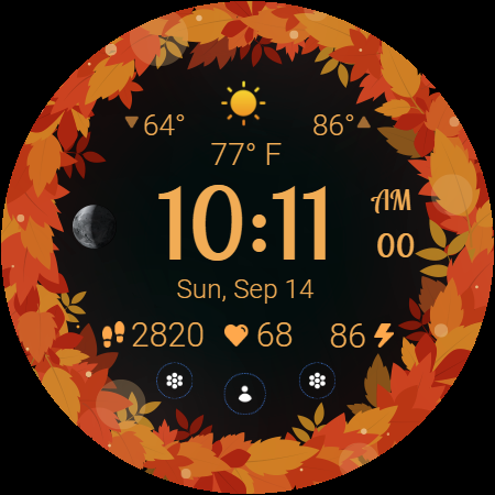 Autumn Leaves Watch Face offers a rich set of features designed to enhance your smartwatch experience. Here are five notable highlights: 1. Customizable Design - Choose from 30 autumn-inspired color themes and 5 background options allowing you to tailor the watch face to your personal style. 2. Weather Integration - Get real-time weather updates including current minimum and maximum temperatures displayed in your preferred unit alongside live conditions. 3. Health Tracking - Monitor your fitness journey with integrated health features displaying heart rate steps and battery status directly on your wrist. 4. Smooth Animations - Enjoy visually pleasing transitions as animated leaves retract to reveal the vibrant active design when waking your watch. 5. Always-On Display - In ambient mode falling leaves create a cozy autumn atmosphere while conserving battery life ensuring extended usability.