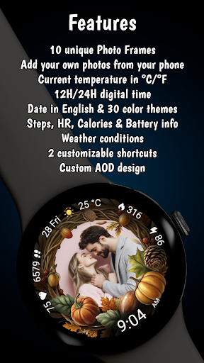 Autumn Photo Frames for WearOS is a popular app with a ton of features and customization options. Here are five of our favorites: 1. Custom Photo Support - Users can place their own pictures directly inside the frame from their phone, creating a personalized watchface experience. 2. Autumn-Themed Frames - With 10 unique autumn photo frames designed with seasonal colors and decorative elements, users can match their style effortlessly. 3. Health Metrics Display - The watchface shows heart rate, step counter, and calories burned information in real time, helping users track their daily activity. 4. Weather Information - Including temperature in u00b0C or u00b0F and accurate weather condition icons, this feature keeps users informed about current weather conditions. 5. Always-On Display - Optimized visibility with reduced battery consumption ensures users can check their watchface anytime without significant power loss.