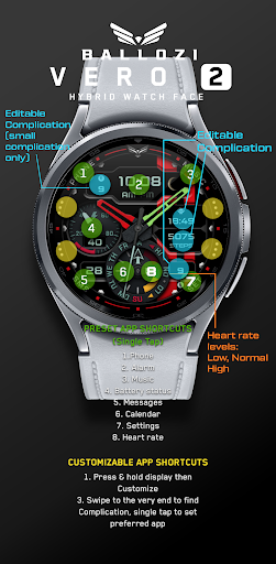 Ballozi VERO 2 Hybrid Analog is a feature-rich watch face designed specifically for Wear OS smartwatches offering users a customizable and informative timekeeping experience This modern hybrid watch face combines analog and digital elements providing a versatile interface that adapts to different user preferences and needs The application supports smartwatches running Wear OS 50 or higher ensuring compatibility with the latest wearable technology One of the key strengths of Ballozi VERO 2 is its extensive customization options which allow users to personalize various aspects of the watch face from background styles to theme colors Users can choose from 10 background styles 12 theme colors and 10 watch hand colors creating a unique look that suits their personal style Additionally the app offers practical features like battery percentage display step counter date and day of week and moon phase indicators making it both aesthetically pleasing and functionally useful The ability to customize complications and app shortcuts further enhances the user experience by providing quick access to frequently used applications Overall Ballozi VERO 2 serves as an excellent choice for smartwatch users seeking a balance between style and functionality in their wearable devices