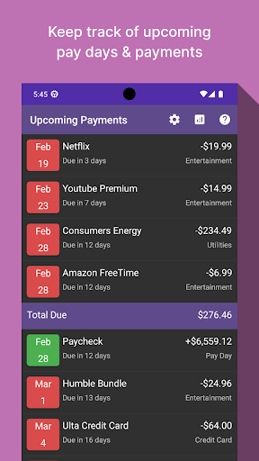 Bill Manager comes packed with features that make bill tracking and financial management straightforward and insightful. Here are five standout features 1. Upcoming Bills Tracker - This feature provides a detailed list of all pending bills including their amounts and deadlines helping users prioritize payments effectively. 2. Payday Reminder - Users can input their payday information and receive notifications about when their next paycheck is expected, allowing for better cash flow management. 3. Analytics View - With this feature, users can analyze their spending habits by viewing categorized expenses on a monthly or yearly basis, offering insights into where money is being spent. 4. Customizable Notifications - The app allows users to set personalized reminders for bill payments, ensuring they never overlook an important due date. 5. Account Integration - Users can link multiple accounts to the app, providing a unified view of all financial obligations in one place, simplifying the management process.