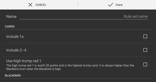 Blackbird stands out among digital card games with its impressive range of customization options. Here are five notable features that make this app special 1 Customizable Rule Sets - Choose between Kentucky Discard or Western Wyoming rule sets or create your own combination allowing for personalized gameplay experiences. 2 Special Blackbird Card - Utilize the unique Blackbird card which can be worth 10.5 points or played anytime adding strategic depth to each round. 3 Adjustable Scoring System - Modify the game-winning score and enable bonuses for taking the most tricks giving you control over the game's difficulty and rewards. 4 Multiple Point Variations - Experiment with different point values including 1s worth 15 points or red 1s worth 30 points for diverse scoring strategies. 5 AI Opponent - Compete against a challenging computer opponent that adapts to your skill level providing an engaging and competitive card-playing experience.