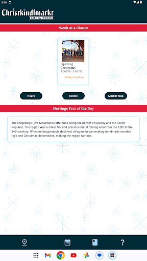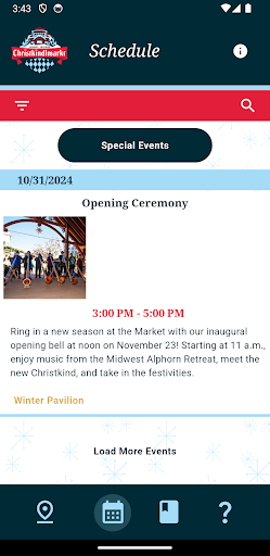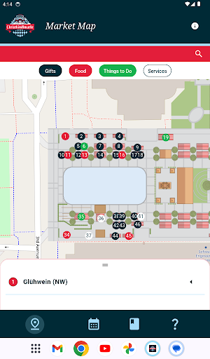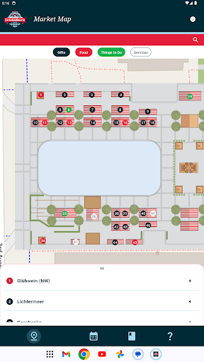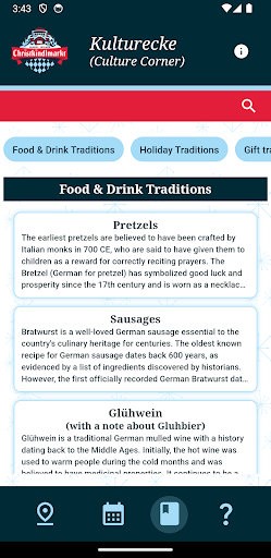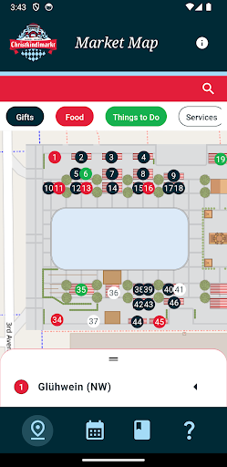 Carmel Christkindlmarkt app offers a variety of features tailored to enhance your visit to the German-inspired holiday market. Here are five notable features 1. Interactive Map - Navigate the market effortlessly with an interactive map that pinpoints vendor huts, food stalls, and activity areas, ensuring you find your favorite spots quickly. 2. Event Schedule - Access a comprehensive schedule of events, allowing you to plan your visit according to performances, workshops, and special appearances by holiday characters. 3. Cultural Insights - Learn about German traditions and customs through dedicated articles, enriching your understanding of the market's cultural significance. 4. Kids Activities Guide - Discover family-friendly activities including free crafts in the Kinderecke and meet-and-greets in the Spielhaus, making it a fun outing for all ages. 5. Ice Skating Information - Get details on the outdoor ice skating rink including rental fees and timings, so you can enjoy a glide on the ice during your visit.