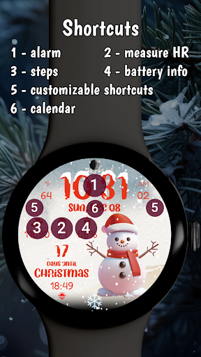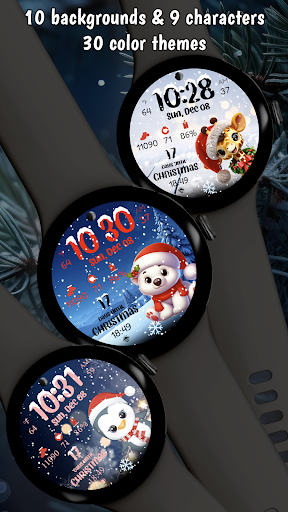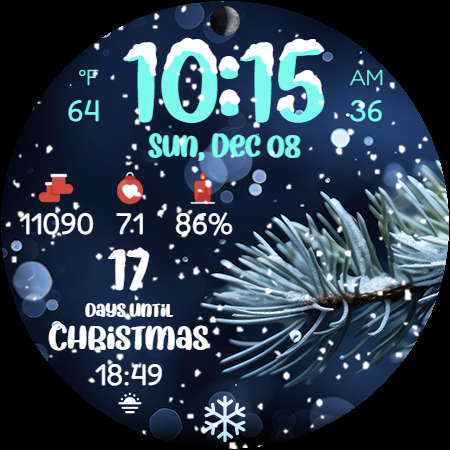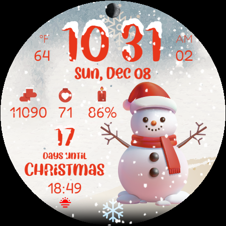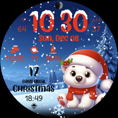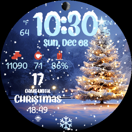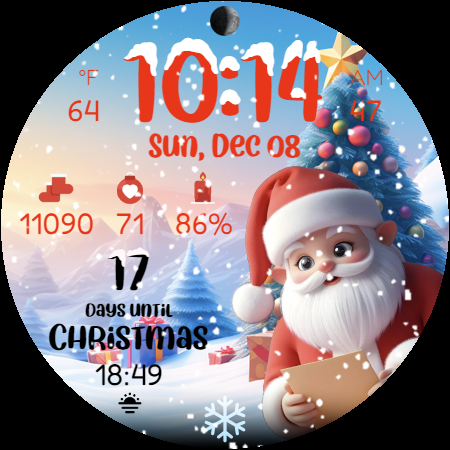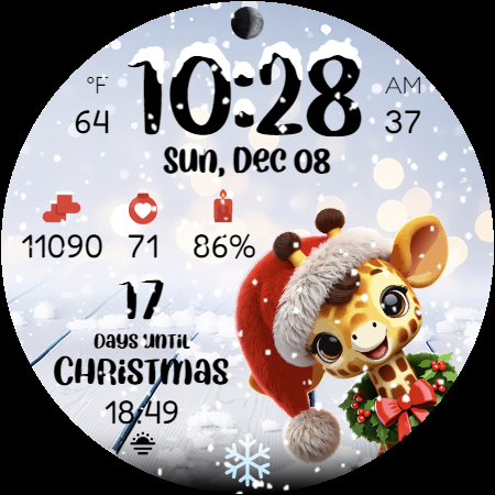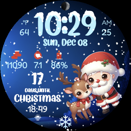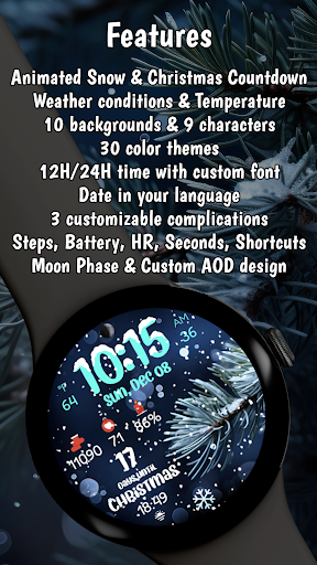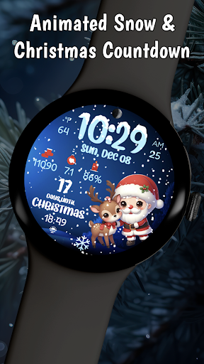 Christmas Countdown Weather is packed with delightful features that make it the ultimate holiday watch face for Wear OS devices. Here are five notable features that set this app apart 1 Christmas Countdown Timer - The watch face prominently displays a beautifully designed countdown timer showing exactly how many days remain until Christmas arrives helping users build excitement for the holiday season 2 Festive Character Selection - Users can choose from 9 charming Christmas companions including Jolly Santa Claus cute reindeer and other holiday characters each bringing their own unique Christmas charm to the watch face 3 Winter Wonderland Effects - The app features mesmerizing animated snowfall that creates a magical atmosphere on your wrist with smooth animations optimized for battery life ensuring both beauty and efficiency 4 Extensive Customization Options - With 10 Christmas-themed backgrounds multiple color themes and various customization settings users can personalize their watch face to match their holiday spirit and preferences 5 Comprehensive Smart Features - Beyond its festive appearance the app includes practical functions such as weather display temperature readings step counter heart rate monitoring battery indicator moon phase display and date information all optimized for the latest Wear OS devices providing both style and substance in one package