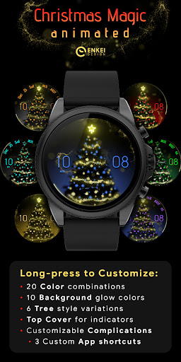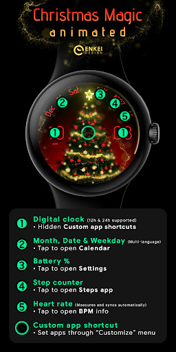 Christmas Magic watch face is packed with features and customization options Here are five notable aspects 1 Customizable Design - Users can choose from 20 accent colors 10 background colors and 6 tree styles to create a personalized look that suits their taste 2 Useful Indicators - The watch face displays essential information including time date steps counter heart rate and battery percentage offering both functionality and style 3 Interactive Elements - By tapping on different sections of the watch face users can access hidden app shortcuts or open specific apps like Calendar Settings or Steps tracking 4 Battery Efficient AOD - The always-on display mode is designed to use less than 3 of active pixels ensuring that the watch face remains energy-efficient while still showcasing the beautiful design 5 Long-press Customization - A long-press on the watch face brings up a comprehensive customization menu where users can adjust various settings including top cover visibility and complications setup