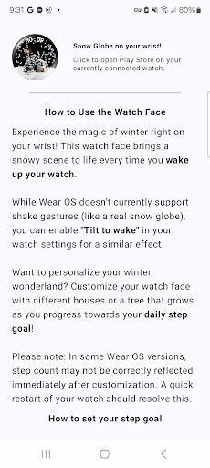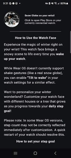 Christmas Snow Globe WatchFace is a festive-themed watch face designed for Wear OS 4+ devices. This application brings the enchanting ambiance of winter holidays directly to users' wrists through captivating animations and customizable features. At its core the app offers mesmerizing snowfall animation that activates every time users wake their smartwatch. Beyond just visual appeal it includes deep customization options such as stunning night sky backgrounds charming animal-themed houses and an interactive Christmas tree that grows based on daily step goals. The app also integrates functional elements with six custom complication slots providing quick access to essential information like heart rate weather and steps. Compatible with Wear OS 4+ and enhanced by a companion phone app for setup this watch face combines both aesthetics and practicality making it an excellent choice for those who wish to carry the holiday spirit with them while staying connected and motivated throughout the day.