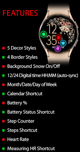 Christmas Snow On Off Watch offers a wide array of features that cater to both style and functionality Here are five notable aspects 1 Customizable Design Options - Users can choose from 5 decor styles 4 border styles and select between black or snowing backgrounds allowing for over 30 unique combinations 2 Battery Friendly Animation - The app includes an optional snow animation feature that can be turned on or off providing a visually appealing yet energy-efficient experience 3 Automatic Time Synchronization - The digital clock automatically syncs with the user s phone ensuring precise timekeeping in either 12-hour or 24-hour formats without leading zeros in the 12-hour mode 4 Comprehensive Health Tracking - In active mode the watch face displays a step counter heart rate monitor and shortcuts to health applications promoting an active lifestyle 5 Always-On Display Functionality - Even in always-on mode the watch face continues to show important information such as the time day of the week date month and battery percentage ensuring constant access to key details