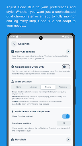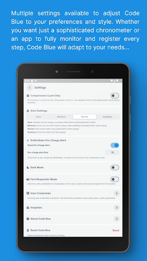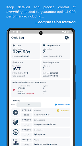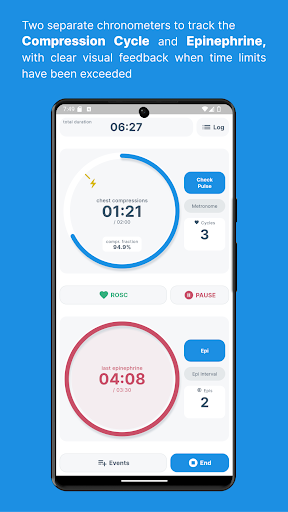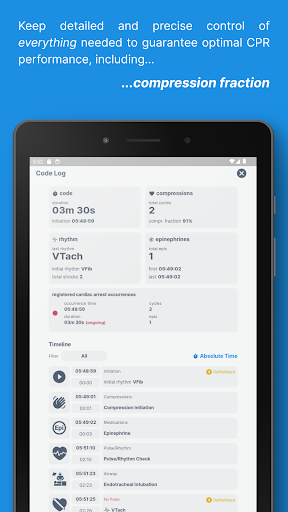 Code Blue CPR Timer is packed with features that cater to the specific needs of healthcare professionals managing cardiac arrest situations. Here are five key features that make this app stand out 1 Dual Chronometer - This feature includes two separate timers that provide high contrast visual feedback when time limits have been exceeded, ensuring precise monitoring of CPR compression cycles and epinephrine doses. 2 Full Log - At any point during the code, users can access a comprehensive log containing crucial parameters and a detailed timeline of all registered events, facilitating accurate record-keeping and post-event analysis. 3 Compression Fraction - By tracking compression fraction and other available parameters, the app helps optimize CPR performance, leading to better patient outcomes. 4 Fully Customizable - Users can save their own medications, procedures, and rhythms, tailoring the app to fit specific protocols and preferences. 5 Multiple Settings - Whether you need a simple CPR timer or a fully functional app for complex cardiac arrest occurrences, Code Blue can be adjusted to meet various requirements, offering flexibility and control.
