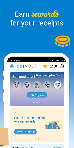 CoinOut is a shopping application that allows users to earn rewards by scanning paper receipts and online order e-receipts. It offers a variety of features including earning Coins for submitting receipts, connecting email accounts for automatic rewards, and completing missions for additional Coins. CoinOut can be used on mobile devices, making it a versatile tool for shoppers who want to maximize their rewards. One of the best things about CoinOut is that it provides multiple ways to earn, such as through receipt scanning, account connections, and playing games via CoinPlay. This means that users have numerous opportunities to accumulate Coins and redeem them for valuable gift cards. And, if you're using CoinOut on your smartphone, you can even participate in missions and level up to increase your earning potential. Overall, CoinOut is an excellent application for those looking to get rewarded for their everyday purchases. Whether you're interested in earning gift cards, leveling up for more Coins, or simply trying out new ways to save, it's a great option