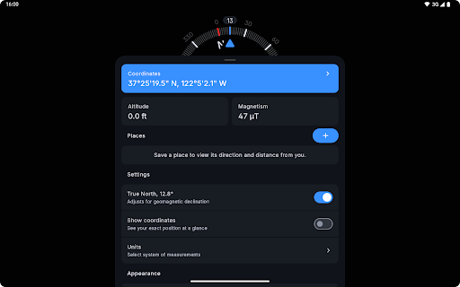 Compass is packed with innovative features that cater to diverse navigation needs. Here are five standout capabilities 1. Versatile Coordinate Systems - Compass supports multiple coordinate formats including DMS DD UTM MGRS and OLC allowing users to choose their preferred display method for precise location tracking. 2. Customizable Display Options - Users can personalize their experience by switching between dark and light themes applying dynamic colors from Android 12 and using a red screen filter for better night vision. 3. Advanced Navigation Tools - The app includes a bubble level angle difference measurement magnetic field detection and anomaly alerts ensuring comprehensive navigation assistance. 4. Place Saving Functionality - Save specific locations to easily monitor direction and distance providing convenience for frequent travelers and outdoor enthusiasts. 5. Privacy-Centric Design - Compass operates fully offline without collecting user data or displaying ads making it an ideal choice for privacy-conscious individuals who require uninterrupted navigation.
