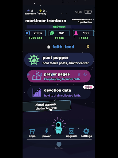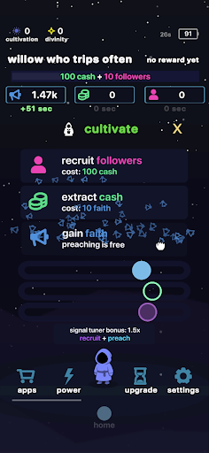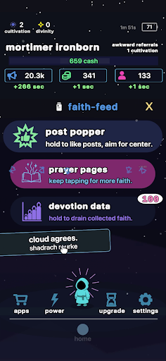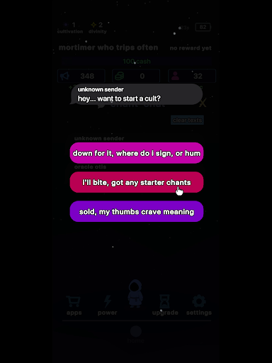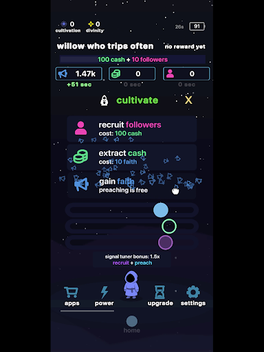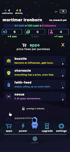 Cozy Cult stands out with its creative approach to simulation gaming. Here are five notable features that make the game special 1. Ascension System - Players can ascend their leader at the end of each era, resetting their progress but keeping permanent upgrades for future runs. This creates a compelling loop of growth and experimentation. 2. Automation Apps - Unlock apps that help automate resource collection and other tasks, allowing for a more relaxed gameplay experience as your cult expands. 3. Combo Building - Experiment with different combinations of upgrades and powers to discover synergies that boost your cult's efficiency and growth potential. 4. Short Play Sessions - Designed for quick 5-10 minute sessions, making it easy to pick up and play whenever you have a few spare moments throughout the day. 5. Light Satire and Friendly Vibe - The game pokes fun at cult dynamics with its humorous writing and charming visuals, creating a welcoming atmosphere while you build your empire.