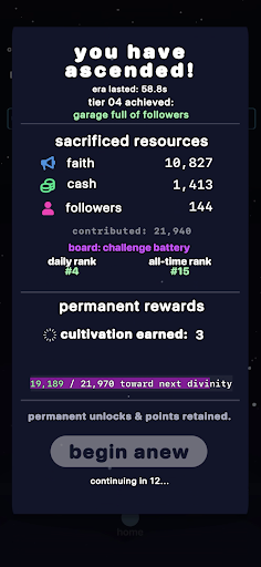 Cozy Cult is a simulation game that lets players experience the quirky journey of starting and growing their own cult. In this unique mobile game, users can collect faith, manage resources, recruit followers, and unlock apps to automate various tasks. The game features an engaging loop where players ascend their leader at the end of each era, donating accumulated resources to divinity while retaining permanent upgrades for subsequent runs. With short play sessions lasting 5-10 minutes, Cozy Cult offers a perfect blend of idle gameplay and strategic decision-making. Available on mobile platforms, the game emphasizes light-hearted satire, friendly aesthetics, and satisfying numerical growth. Whether you're a fan of simulation games or simply looking for a cozy way to pass the time, Cozy Cult provides an entertaining experience with its charming mechanics and humorous take on cult management.