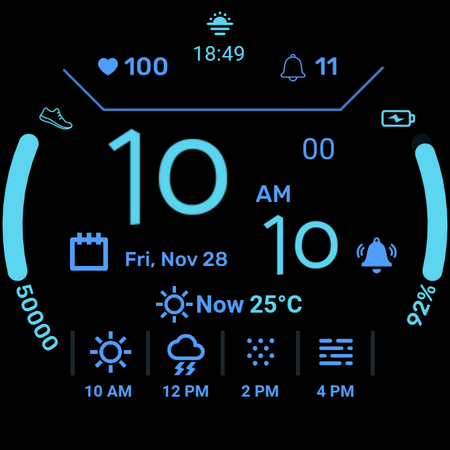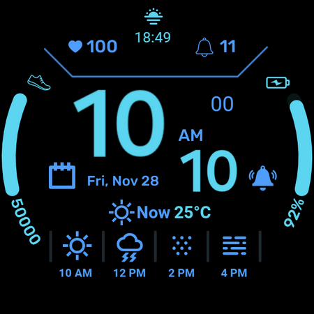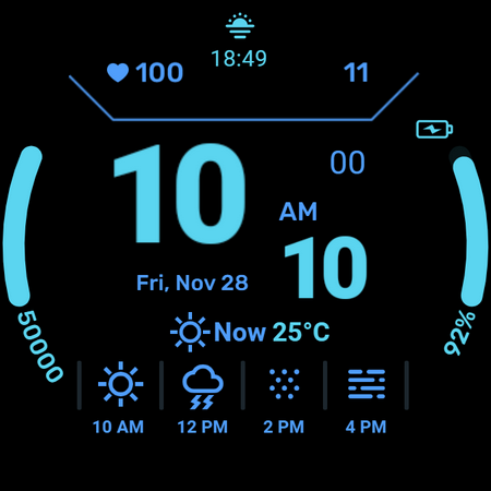 Daily Weather Forecast Watch Face offers a diverse set of features that cater to both weather information needs and personal wellness tracking Here are five notable characteristics 1 Real time Weather Updates - The application provides current weather conditions and temperatures with support for both Celsius and Fahrenheit measurements Users can view a four hour weather forecast represented by clear weather icons such as sunny rainy snowy or cloudy 2 Comprehensive Fitness Tracking - In addition to weather data the app displays heart rate readings daily step count and progress toward fitness goals making it a complete health companion 3 Customizable Interface - Users can personalize their watch face experience by choosing from various accent colors for weather icons time display and other data elements 4 High Readability Design - The watch face features large easy to read digital time display along with full date information all optimized for visibility even in direct sunlight 5 Battery Efficient Operation - Engineered to minimize power consumption the application maintains its feature rich environment while preserving smartwatch battery life