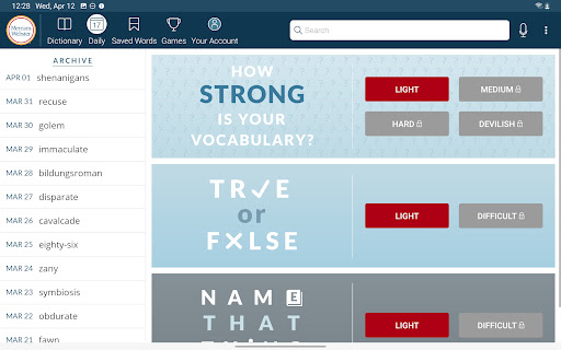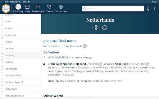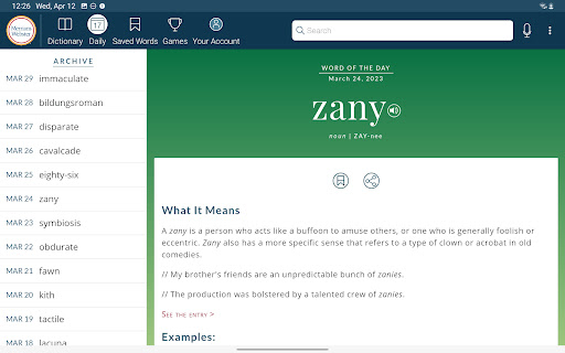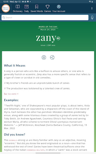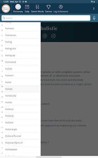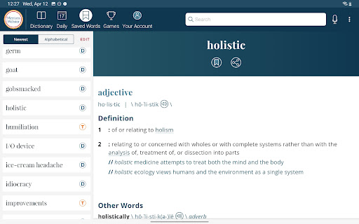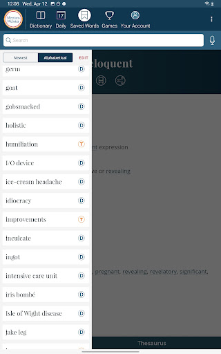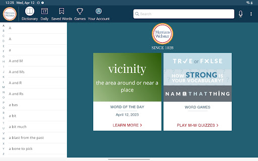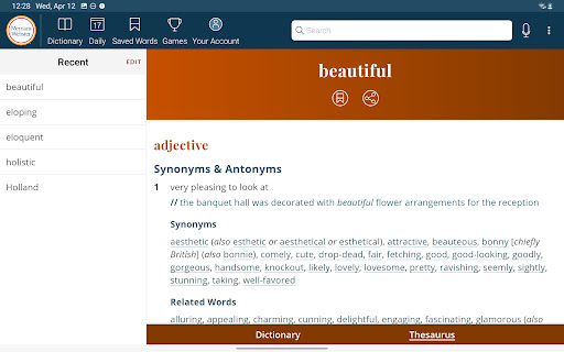 Dictionary is a comprehensive reference application that provides users with America's most trusted dictionary content optimized for Android devices. The app serves as an essential tool for English language learning, education, and vocabulary building. With continuous updates ensuring the inclusion of the latest words and meanings, Dictionary remains a reliable resource for both casual users and dedicated word enthusiasts. A standout feature is its offline functionality, allowing users to access definitions and synonyms without an internet connection, while features like audio pronunciations and illustrations require connectivity. The app also introduces engaging word games and vocabulary-building quizzes, making language learning enjoyable. Whether you're a student, professional, or simply someone who loves words, Dictionary offers valuable tools such as a Word of the Day, example sentences, and integrated thesaurus entries. Its premium features include graphical illustrations and expanded content covering people and places, providing an enriched learning experience across all user levels.