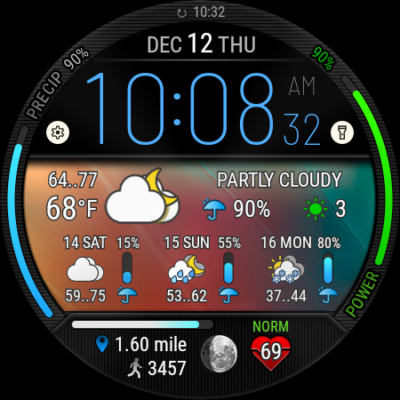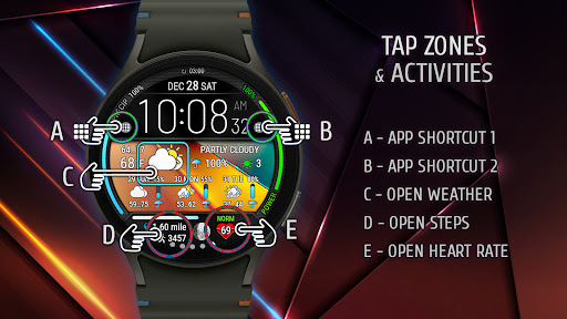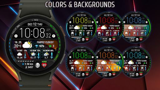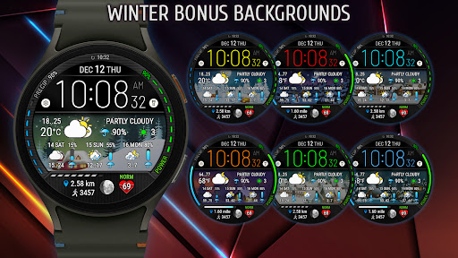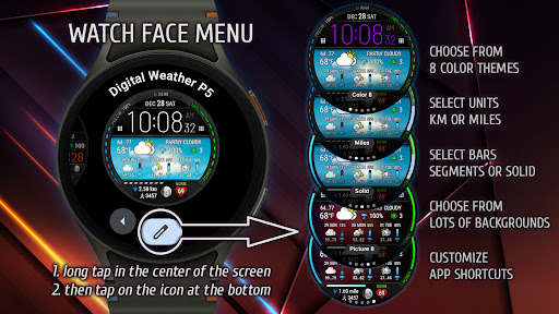Digital Weather Watch face P5 offers a wide array of features that cater to both practicality and personal style preferences Here are five notable features 1 Customizable Color Themes - With 8 different color themes available users can tailor the watch face appearance to match their mood or outfit 2 Dynamic Weather Integration - The watch face pulls data from The Weather Channel or other system sources to display real-time weather updates and a 3-day forecast ensuring users stay prepared for changing conditions 3 Fitness Tracking Display - It provides essential health metrics like heart rate step count and distance traveled helping users monitor their daily fitness goals directly from their wrist 4 Multiple Background Options - Choose from 8 standard backgrounds plus 8 bonus winter backgrounds each reflecting the current weather state for a visually engaging experience 5 App Shortcut Customization - Two customizable shortcut areas allow users to launch their most-used apps directly from the watch face enhancing convenience and workflow efficiency