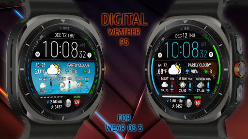Digital Weather Watch face P5 is a feature-rich watch face designed specifically for Wear OS 5 devices offering users an enhanced timekeeping experience with integrated weather information The watch face displays digital time current weather conditions a 3-day weather forecast and the moon phase alongside fitness tracking metrics such as heart rate steps and distance traveled One of its standout features is the extensive customization options including 8 color themes 8 regular backgrounds and an additional 8 winter-themed backgrounds which adapt to the current weather state Users can also set up two app shortcuts for quick access to their favorite applications The design ensures compatibility exclusively with Samsung Galaxy Watch 7 and Ultra models running Wear OS 5 making it a specialized tool for users seeking both functionality and personalization in their smartwatch experience
