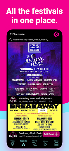 Edmtrain Concerts & Raves stands out with its diverse set of features designed to enhance the event discovery process. Here are five key highlights: 1. Extensive Event Coverage - From electronic music genres like House, Techno, Dubstep to other popular genres such as hip hop and rock, the app covers a wide array of concerts and festivals across North America. 2. Music Integration - Before attending a show, users can listen to the performing artists' music directly through the app, enhancing pre-event excitement and discovery. 3. Ticketing and Directions - With official ticket links and integrated directions to venues, planning your attendance is seamless and straightforward. 4. Community Curation - Users have the power to add events themselves, ensuring the most up-to-date and comprehensive listings available. 5. Media Updates - Stay informed about the latest news and updates in the electronic music scene, keeping you connected to the culture and community.
