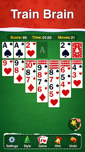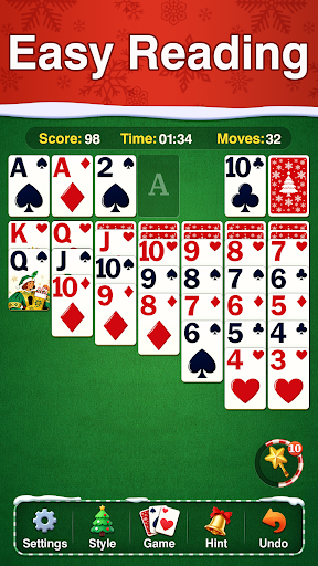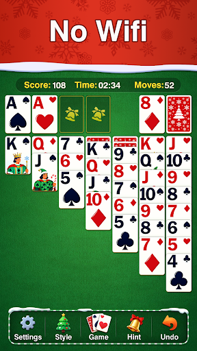 Festival Solitaire Christmas Edition is packed with features that enhance the traditional solitaire experience. Here are five notable highlights 1 Eye Protection Theme - Enjoy an enhanced visual experience with enlarged fonts and cards coupled with soothing color schemes designed to protect your eyesight during extended play sessions. 2 Offline Play Capability - Whether you are traveling or simply away from Wi-Fi this feature allows uninterrupted access to the game ensuring entertainment regardless of your location. 3 Multiple Game Modes - Choose between drawing one or three cards and switch difficulties as you please offering diverse challenges tailored to your skill level. 4 Intelligent Magic Wand - When stuck on a difficult move activate the magic wand feature which intelligently suggests your next strategic move helping maintain the flow of the game. 5 Customizable Sensory Settings - Personalize sound vibration and click effects to create an immersive environment complemented by joyful Christmas soundscapes adding another layer of enjoyment to each session.