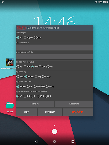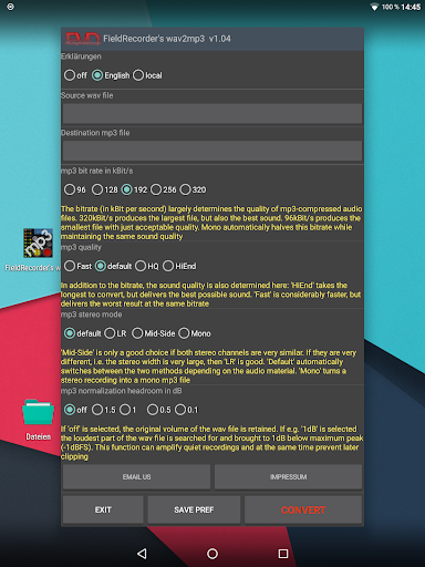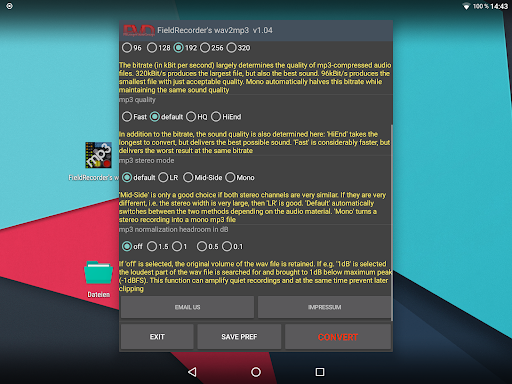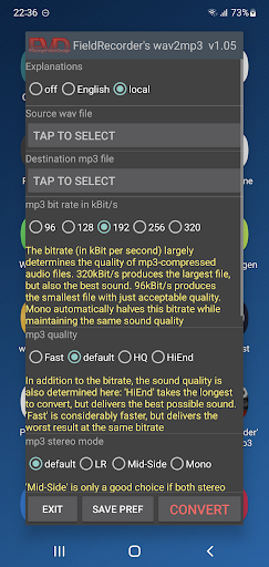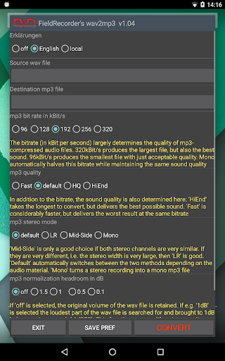 FieldRecorder's wav2mp3 offers a variety of features that enhance the user experience while maintaining simplicity and efficiency. Here are five notable features 1. Minimalist Interface - The app focuses on providing a clean and straightforward interface with just one screen for all operations ensuring users can convert files without distractions or unnecessary steps. 2. Customizable Encoding Options - Users can adjust encoding parameters such as bitrate complexity and stereo mode allowing for tailored audio output that meets specific quality and file size requirements. 3. Background Processing - Once the conversion starts the app processes files in the background enabling users to multitask or even close the app while the task completes seamlessly. 4. Language and Display Flexibility - The app supports explanatory texts in multiple languages or can hide them entirely giving users control over how much guidance they receive during the conversion process. 5. Integration with Field Recorder - For users of the professional audio recorder app Field Recorder this app offers seamless integration allowing for invisible remote control of the conversion process directly from the recording interface.