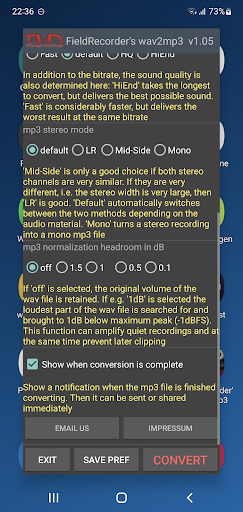 FieldRecorder's wav2mp3 excels in delivering a hassle-free audio conversion experience with its ad-free interface quick processing and customizable options. The app's lightweight design ensures minimal storage usage while its ability to operate in the background adds convenience for multitasking users. Additionally the availability of advanced encoding settings makes it suitable for both beginners and audio enthusiasts. However the app is limited to Android users and lacks some features found in more comprehensive audio tools such as batch processing or support for additional file formats. Some users may also find the absence of detailed tutorials challenging when exploring complex settings. Overall FieldRecorder's wav2mp3 is a reliable choice for anyone needing a straightforward yet flexible solution for converting WAV files to MP3 on Android devices.