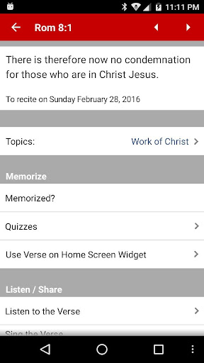 Fighter Verses is an educational Bible memory application designed to help users of all ages persevere in their faith by memorizing Scripture. The app offers a comprehensive system that allows individuals groups or entire churches to memorize and review verses at their own pace. With over 1000 preloaded verses organized into two complete five-year collections Fighter Verses provides a structured approach to Bible memory. The app supports eleven different Bible translations including ESV NIV NASB and others with some available at an additional cost. Users can add any verse they want using the My Verses feature and organize them with topics tags and categories. The app includes six unique quizzes plus a Reference Matching Quiz to aid memorization such as Quick Blanks Quiz Recite Aloud Quiz and more. A key feature is the REVIEW function which presents memorized verses at customizable intervals for long-term retention. Other notable features include Foundation Verses for children songs to aid memorization through music a topical index and social integration for sharing progress. Available on Android devices Fighter Verses also offers blog commentary audio recitations and the ability to read whole chapters or Bible commentaries making it a versatile tool for spiritual growth.