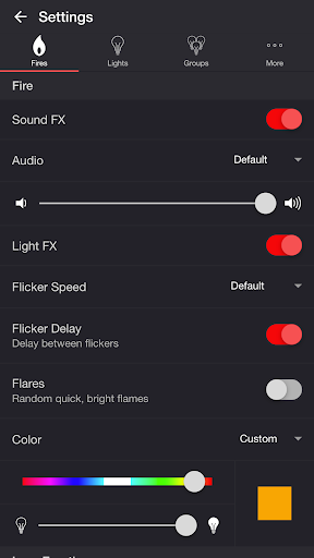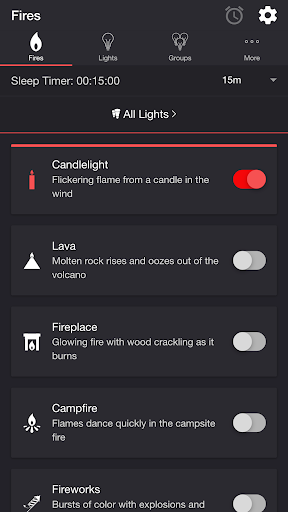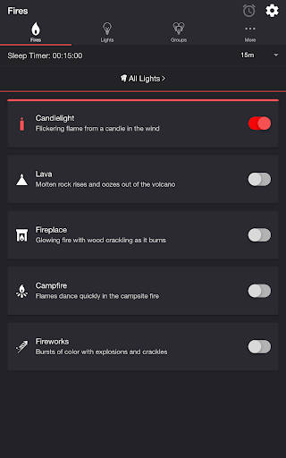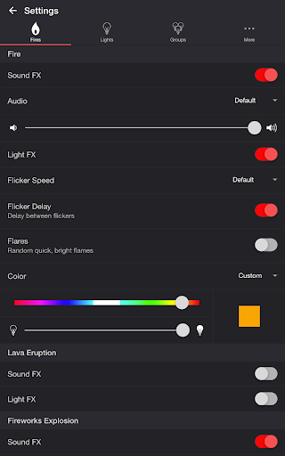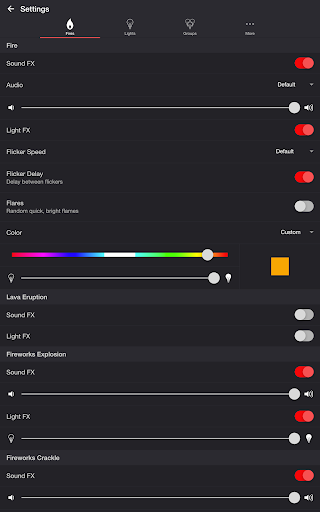 Firestorm for Hue stands out with its diverse range of customizable features. Here are five notable aspects: 1. Multiple Fire Effects - Choose from various fire presets like Candlelight, Fireplace, and Campfire, each offering unique light patterns and sound effects. 2. Advanced Customization Options - Adjust flicker speed, brightness, color, and audio settings to personalize each lighting effect according to your preference. 3. Comprehensive Sound Settings - Toggle and modify sound effects for fire, eruptions, and fireworks while controlling independent volumes for each element. 4. Sleep Timer Functionality - Set automatic timers with fade-out features and define end states for lights, allowing for worry-free relaxation or sleep. 5. Multi-Light Support - Control individual bulbs or groups/zones, creating synchronized light shows across multiple Philips Hue devices for enhanced room coverage.