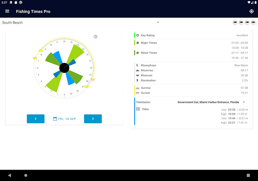 Fishing Times Pro offers a variety of features tailored specifically for fishing enthusiasts Here are five key highlights 1 Solunar Clock Interface - Provides a visual representation of the best fishing times using green bars for major and minor periods blue bars for tide times and a gray line indicating the current time This intuitive display helps anglers quickly identify optimal fishing windows 2 Multiple Location Support - Users can manage and switch between various fishing locations making it easier to plan trips in different areas The app ensures that solunar data is accurate for each specific location 3 Day Rating System - Offers a simple rating from 1 to 4 fishes indicating the quality of fishing conditions for each day This feature helps anglers decide when to go fishing for the best results 4 Tide and Lunar Information - Displays crucial details such as sunrise sunset moonrise moonset and moon phases All of this information is essential for understanding how natural cycles affect fish activity 5 Minimal Permissions and Footprint - Unlike many other apps Fishing Times Pro requires minimal permissions and has one of the smallest installation sizes ensuring a smooth and unobtrusive user experience