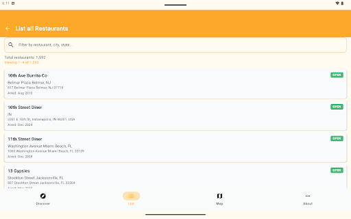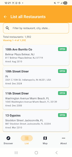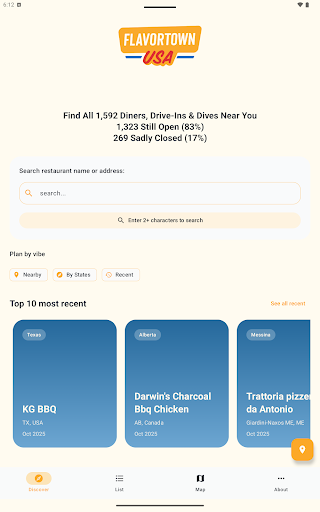 Flavortown offers a rich set of features tailored for food and travel enthusiasts. Here are five key highlights 1 Find Nearby Joints - Quickly locate the closest Diners Drive-Ins and Dives restaurants using the Nearby button which utilizes your current location to display nearby options. 2 Search by State City or Address - Plan your trips effectively by searching through the map feature allowing you to discover dining spots in any area you intend to visit. 3 Comprehensive Restaurant Information - Access essential details such as phone numbers websites and social media profiles directly within the app ensuring you have all the information needed for a seamless dining experience. 4 Always Up to Date - The app's database is regularly refreshed with newly discovered restaurants ensuring that users always have access to the latest and greatest dining spots. 5 Built by Fans for Fans - Created by true fans of the show Rick and Jennifer who started following it back in 2008 this app reflects genuine passion and understanding of what diners are looking for providing a trustworthy and relatable user experience.