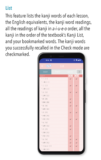 GENKI Kanji for 3rd Ed offers a wide array of features that enhance the kanji learning process Here are five notable ones 1 SelfPaced Learning Environment - Users can study kanji words at their preferred speed with access to readings stroke order animations and native audio pronunciations 2 Intelligent Study Tracking - The Check mode intelligently tracks user progress by sorting words into mastered and unmastered categories optimizing study efficiency 3 Rich Educational Content - Each kanji includes detailed information with illustrations mnemonic hints and stroke order animations sourced from the popular Kanji Look and Learn resource 4 Customizable Study Lists - Learners can bookmark challenging words creating personalized study lists for targeted review 5 Multiple Listing Options - The List mode provides various organizational views including lesson order alphabetical and onkun lists with automatic progress tracking indicators