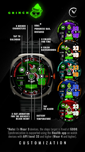 The GRINCH Christmas Watch Face brings fun and festivity to smartwatches with its unique Grinch theme and x-ray heart animation Its wide range of customization options allows users to adjust colors characters and AOD settings to suit their preferences The inclusion of health metrics and practical information makes it more than just a novelty item However some features may not be compatible with all devices which could limit functionality for certain users Additionally enabling all permissions is required for full access to the watch faces capabilities Despite these minor drawbacks its creative design and versatility make it a great choice for those seeking a holiday-themed wearable experience