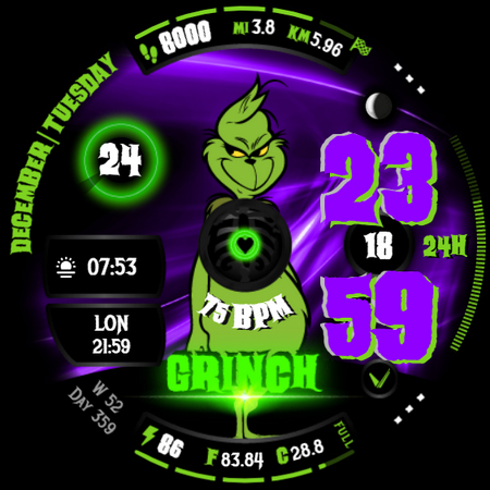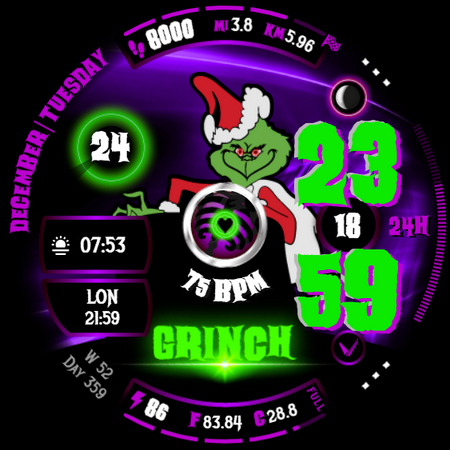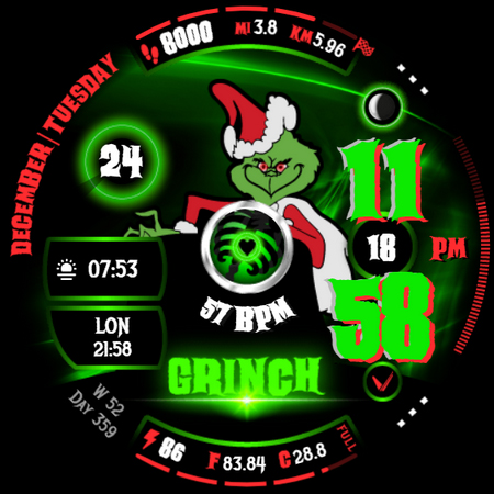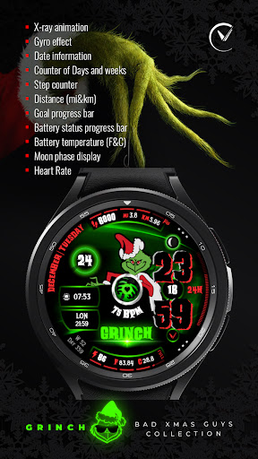GRINCH Christmas Watch Face offers a variety of features that enhance both its aesthetic appeal and functionality First Customizable Characters - Users can select from 3 different Grinch character designs each with unique animations Second Color Options - With 8 time color choices and 6 background colors users can tailor the appearance to their preference Third Animation Effects - The watch face includes gyro effects and an x-ray animation of the Grinchs heart Fourth Health Tracking - It displays important health metrics including heart rate battery temperature and goal progress Fifth Practical Information - The interface shows date moon phase distance traveled and other useful data These features make the GRINCH Christmas Watch Face both visually engaging and functionally robust