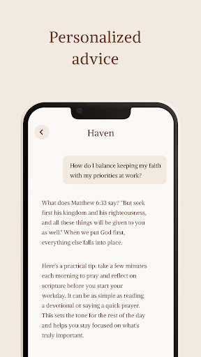 Haven offers a diverse range of features that cater to various aspects of spiritual engagement. Here are five notable highlights: 1. Personalized Responses - Haven uses advanced AI technology to provide customized answers to users' faith-related questions, ensuring relevant and insightful interactions. 2. Daily Devotionals - The app delivers inspiring daily devotionals to help users start their day with spiritual encouragement and reflection. 3. Scriptural Guidance - Haven offers practical solutions for life's challenges by drawing upon the teachings of the Bible, providing users with accessible wisdom. 4. Relationship Support - Users can strengthen their personal relationships through Biblically-based advice on communication, conflict resolution, and mutual understanding. 5. Spiritual Growth Tools - With features designed to enhance spiritual development, Haven helps users explore their faith in a meaningful and progressive manner.
