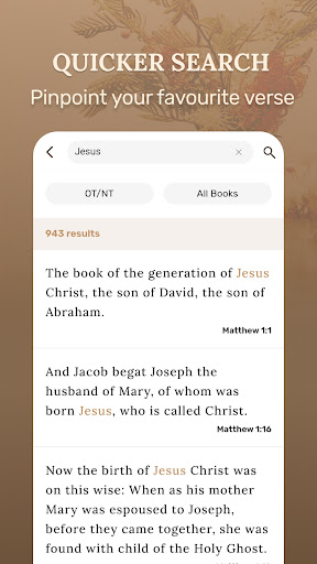Holy Bible KJV Verse is packed with features designed to enhance your Bible study experience. Here are five key highlights 1 Daily Bible Verse - Start each day with a power-packed verse from the KJV to meditate on and draw inspiration from 2 Perfect Bible Audio - Listen to high-quality audio readings of the Bible allowing you to engage with scripture hands-free 3 Engaging Bible Quiz - Test your biblical knowledge with interactive quizzes that make learning fun and informative 4 Cinematic Bible Story Videos - Experience classic Bible stories through visually stunning video presentations 5 Expanded Knowledge - Discover fascinating Bible facts and historical insights that deepen your understanding of scripture