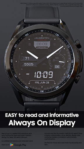 ILLUMINATOR Hybrid-LCD stands out with its extensive customization options and attention to detail Here are five notable features 1 UltraRealistic Design - The watch face boasts a lifelike appearance mimicking traditional LCD watches while incorporating modern digital elements This creates an elegant and timeless look 2 Custom Complications - Users can personalize their experience by configuring four custom complications These allow for tailored information display directly on the watch face enhancing usability 3 Day and Night Themes - With nine daytime and eight nighttime themes available users can switch between vibrant and subdued appearances depending on the time of day or personal preference 4 Health and Utility Indicators - The app includes several useful indicators such as heart rate steps and battery levels providing wearers with quick access to important health and device status updates 5 Always On Display Functionality - The AOD feature ensures that key information remains visible even when the watch is idle Three unique AOD themes and hand colors give users additional control over how their watch appears during these periods