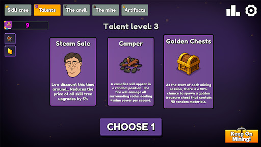 Keep on Mining stands out with its variety of engaging features designed to enhance the incremental gaming experience Here are five notable aspects 1 Automated Mining System - The game's primary feature allows players to mine rocks simply by hovering the cursor over them within the mining area streamlining resource collection 2 Skill Tree Progression - Players can spend material bars to unlock permanent upgrades in the skill tree boosting their mining power and efficiency over time 3 Crafting Mechanics - Users can craft new pickaxes using different materials each providing improved stats for faster and more effective mining 4 Talent Card System - Upon leveling up players receive talent points to choose from random talent cards offering unique bonuses while also increasing rock HP for added challenge 5 Idle Mine Mechanic - Once unlocked the mine automates the mining process and instantly crafts bars providing a true idle gaming experience
