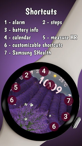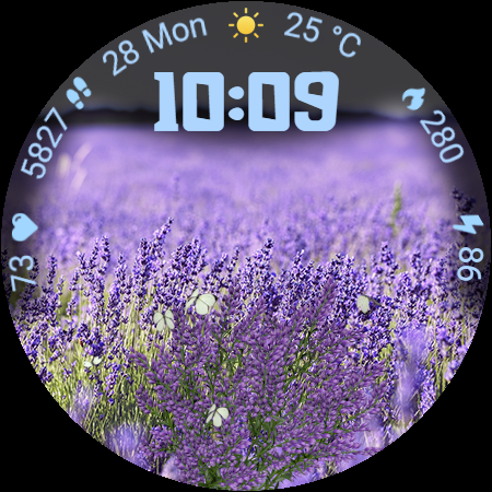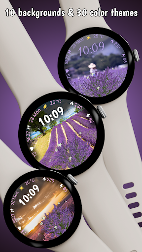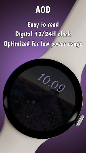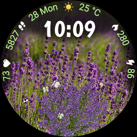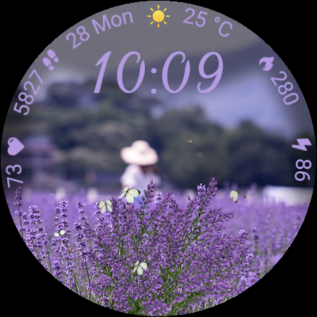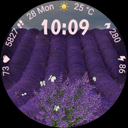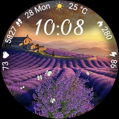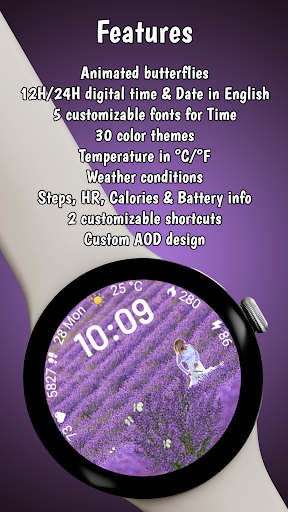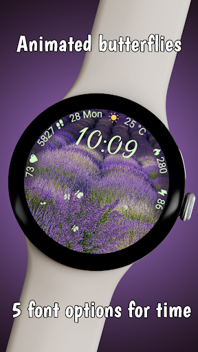 Lavender and Butterflies stands out with its rich feature set Here are five notable aspects 1 Customizable Aesthetics - Users can choose from 10 unique lavender themed backgrounds 5 clock fonts and 30 color themes to create a personalized look 2 Animated Details - Realistic white butterflies flutter across the screen adding a calming and artistic touch to the watch face 3 Health and Activity Tracking - The app integrates step counting heart rate monitoring calorie tracking and battery level display for a practical user experience 4 Weather Integration - Real time temperature and weather condition updates ensure users stay informed about their environment 5 Always On Display Optimization - The AOD mode balances visibility and power efficiency ensuring essential information remains accessible without draining the battery