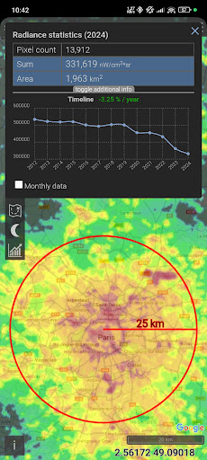 Light Pollution Map is a specialized application designed for individuals interested in exploring and analyzing light pollution levels across the globe. This app combines high-resolution VIIRS satellite data with an interactive global map interface, allowing users to identify the darkest locations nearby. Whether you are an astronomer planning your next stargazing session, an astrophotographer seeking optimal shooting spots, or simply someone curious about night sky quality, this app provides the most accurate and up-to-date nighttime light data available. The app supports various functionalities such as sky brightness estimation using MPSAS and Bortle scale, historical data comparison, and additional layers like Aurora prediction and cloud coverage. It also offers offline-friendly features and respects user privacy with a clean design free of ads or tracking. Available on mobile platforms, Light Pollution Map ensures smooth performance and intuitive controls, making it an essential tool for anyone passionate about dark skies and environmental monitoring.
