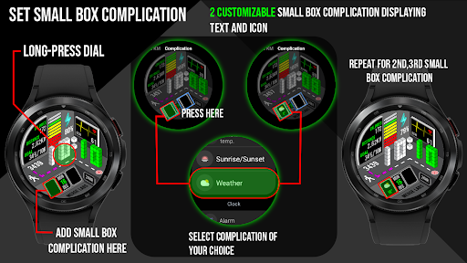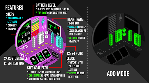 Merge Labs Isometric 5 offers a rich set of features that cater to both aesthetics and functionality. Here are five notable aspects: 1. Customizable Design Options - Users can choose from 25 color combinations and customize two small box complications to display desired information in text and icon formats. 2. Advanced Health Tracking - The app displays daily step counts with a graphic indicator up to a synced goal and continues counting to 50,000 steps, showing calories burned and distance traveled. 3. Heart Rate Monitoring - Featuring a numerical heart rate display with color-changing graphics based on activity levels, users can also launch their default heart rate app by tapping the display area. 4. Intuitive Battery Management - A numeric battery level indicator along with a graphic representation allows users to monitor their device's power, and tapping the battery icon opens the battery app for further management. 5. Practical Time and Date Display - Alongside a 12/24 hour clock, the app shows the day, date, and month, with a tap function to access the calendar app, ensuring users stay informed and organized.