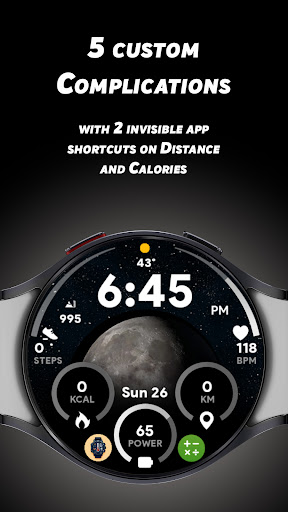 Moon Dial Watch Face stands out with its range of customization options and practical features. Here are five notable aspects of the app: 1. Live Moon Phase Display - Users can view real-time moon phases directly on their watch face providing instant astronomical information. 2. Custom Complications Support - With five available slots for custom complications individuals can tailor the displayed data to suit their specific needs and preferences. 3. Optional Star Effect - For those who enjoy a touch of visual flair the optional star effect adds an attractive backdrop to the watch face. 4. Invisible App Shortcuts - Two cleverly integrated invisible shortcuts on Calories and Distance enable users to launch preferred apps without cluttering the interface. 5. Essential Information at a Glance - From battery percentage to heart rate values all crucial details are easily accessible ensuring users stay informed without needing to navigate away from the main screen.