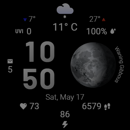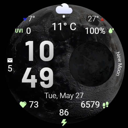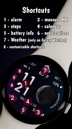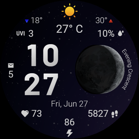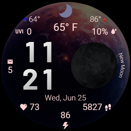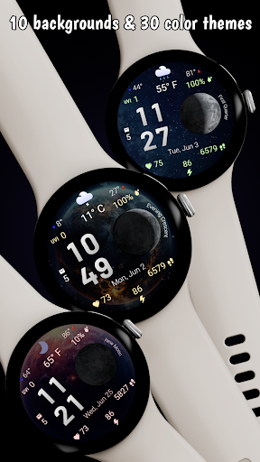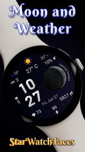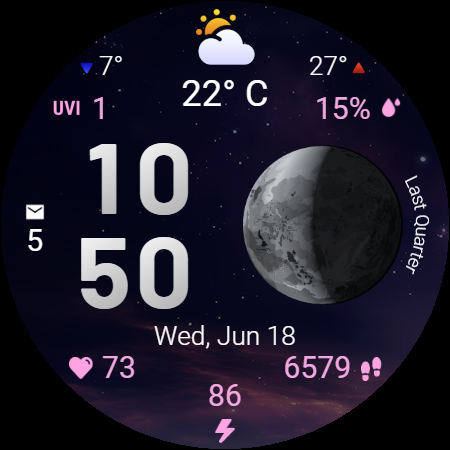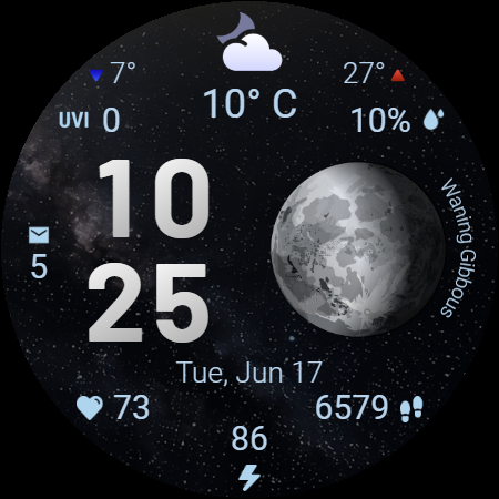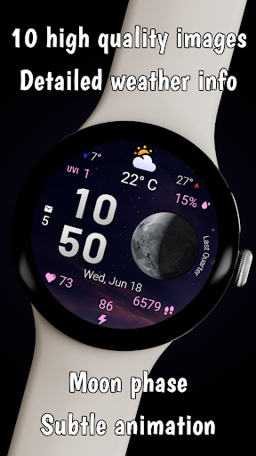 Moon & Weather is a sophisticated watch face application designed for Wear OS smartwatches that combines astronomy, weather information, and health monitoring into an elegant animated display. This app transforms your smartwatch into a personal dashboard showing the night sky with ten space-themed backgrounds featuring subtle animations alongside live moon phase visualization. Users can enjoy thirty customizable color themes while accessing essential data such as time, date, and comprehensive weather details including current temperature, daily min-max temperatures, UV index, and precipitation chances. Additionally, it tracks health metrics like heart rate and steps while displaying system stats such as battery level and unread notifications. Moon & Weather also offers two customizable shortcut areas and an optimized always-on display mode ensuring usability without compromising battery life. Designed primarily for Samsung Galaxy Watches running Wear OS 5 or newer, this app provides an unparalleled blend of aesthetics and functionality making it ideal for stargazers, weather enthusiasts, and those seeking a feature-rich elegant watch face.