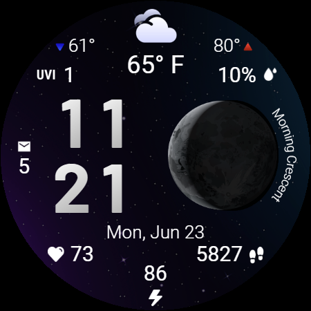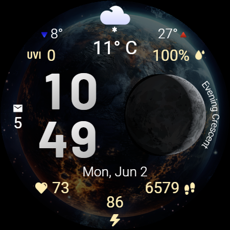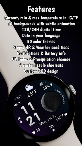 Moon & Weather stands out with its rich set of features tailored to enhance user experience on Wear OS devices. Here are five notable features: 1. Live Moon Phase Visualization - Displays accurate moon phases with labels providing users with real-time astronomical insights right on their wrists. 2. Customizable Space-Themed Backgrounds - Offers ten beautifully animated space-themed backgrounds allowing users to personalize their watch faces according to their preferences. 3. Comprehensive Weather Dashboard - Provides detailed weather information including current temperature, daily temperature ranges, UV index levels, and precipitation probabilities ensuring users stay informed about environmental conditions. 4. Health Monitoring Integration - Tracks vital health statistics such as heart rate and step count empowering users to maintain better control over their fitness goals directly from their smartwatches. 5. Optimized Always-On Display Mode - Ensures continuous visibility of key information even when the screen is in low-power mode by mirroring the main layout thus balancing utility with energy efficiency.
