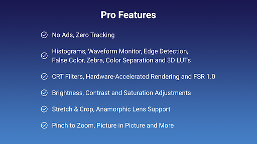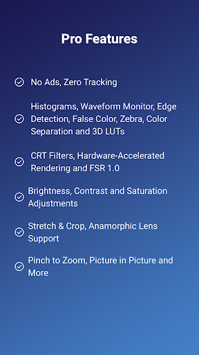 Noir Pro offers an impressive array of professional features that cater to diverse user needs Here are five notable characteristics 1 Advanced Monitoring Tools - The app includes professional grade features such as Waveform Monitor Histogram Edge Detection and False Color providing precise video analysis and calibration options 2 Extensive Format Support - With compatibility for both UVC video streaming and UAC audio streaming users can work with various video and audio formats ensuring broad device support 3 Flexible Display Options - Users can utilize Stretch and Crop Anamorphic Lens Support and Brightness Contrast and Saturation Adjustments to customize their viewing experience 4 Enhanced Usability - Features like Pinch to Zoom App specific Volume Control and Picture in Picture Mode enhance the overall user experience making the app more versatile 5 Professional Workflow Integration - The inclusion of 3D LUTs CRT Filters and FSR 10 support enables seamless integration into professional video editing and color grading workflows