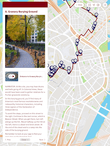 The Official Freedom Trail App is a comprehensive travel guide that allows users to explore Boston's rich historical heritage through an interactive experience. This innovative application offers over 1.5 hours of audio content featuring stories from the Freedom Trail including music and interviews with experts. The app's GPS-enabled audio tour plays automatically at each stop while the interactive map helps visitors navigate the 2.5-mile trail connecting 16 significant historical landmarks. With photos illustrations and detailed information about museums churches meeting houses burying grounds parks a ship and historic markers this app provides an immersive journey into America's revolutionary past. Available exclusively in English the app caters to both local residents and tourists who want to deepen their understanding of American history. As an official product of The Freedom Trail Foundation this app not only serves as a self-guided tour but also contributes to the preservation of Boston's precious historical sites through the Foundation's Preservation Fund. Whether you're a history enthusiast or casual visitor this app offers an engaging way to experience more than 250 years of history.