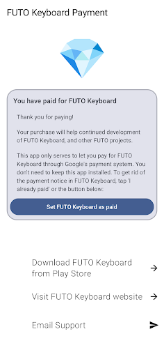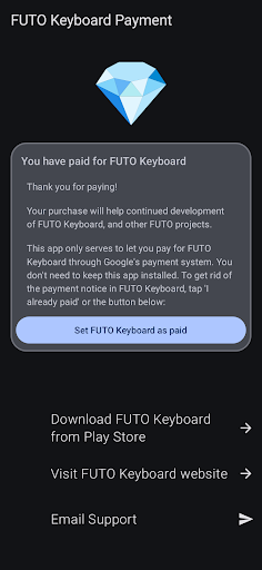 Payment for FUTO Keyboard offers several notable features that enhance the user experience with the main keyboard application. First here are some key highlights Payment Removal Option - After purchasing this app users can eliminate payment notifications from the FUTO Keyboard interface ensuring a cleaner workspace. Google Play Integration - This app provides a dedicated payment channel through Google Play offering a familiar and secure transaction method for Android users. Dependency Management - The app works exclusively with the main FUTO Keyboard application streamlining the payment process while maintaining separation between functionality and financial transactions. User Verification System - It includes mechanisms to verify purchases and apply the payment removal feature accurately across devices. Cross Compatibility Support - Although functioning as a separate entity it ensures seamless integration with the primary keyboard app preserving all premium features after purchase