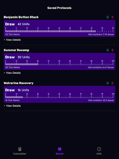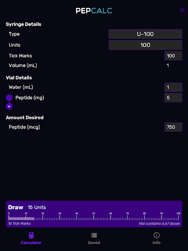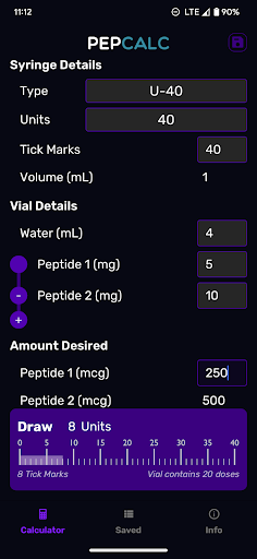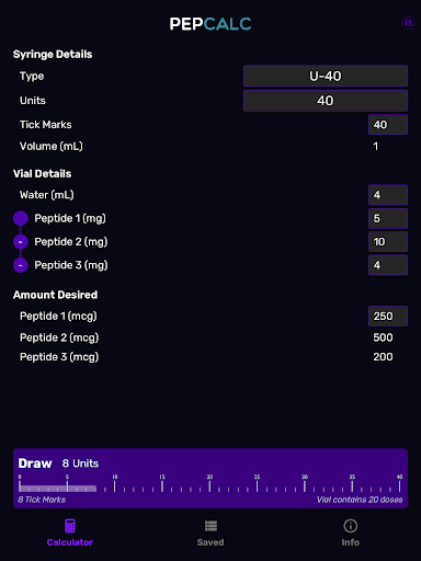 PepCalc is a specialized health and fitness application designed to assist users in accurately calculating peptide reconstitution amounts. This tool stands out by offering fully configurable inputs allowing users to specify parameters such as volume units tick marks peptide quantity and water type. It supports various instrument types including U100 and U40 syringes and provides an option for other custom settings. One of PepCalc's most notable features is its ability to handle multi-peptide blends making it an invaluable resource for professionals working with complex mixtures. The app also offers saved protocols with notes ensuring that users can easily retrieve their favorite calculations without unnecessary retyping. Available on mobile platforms PepCalc enhances user experience with dark mode support and assures privacy with no signup requirement and a commitment to being ad-free. Overall PepCalc is an essential tool for anyone involved in peptide research or applications seeking precision and efficiency in their calculations.