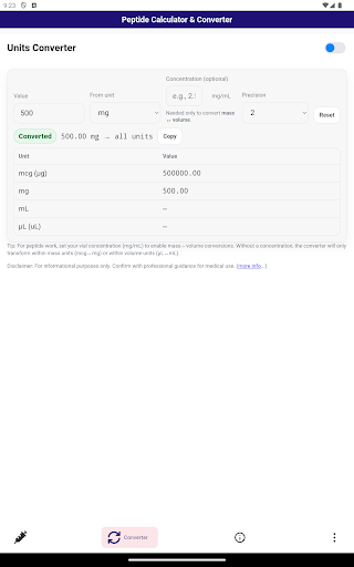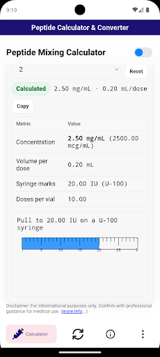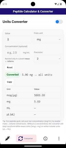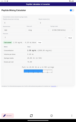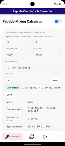 Peptide Mixing Calculator PRO is a specialized application designed for researchers and professionals working with peptides in the health and fitness sector The app serves as an advanced calculation tool that helps users accurately determine peptide dosages by calculating the milligrams of research contained in each unit of an insulin or tuberculin syringe This functionality is particularly useful for those who need precise measurements when reconstituting peptides One of the key features of Peptide Mixing Calculator PRO is its ability to measure both reconstitution and dosage using microgram measurements which allows for accurate readings on insulin syringes Additionally the app provides a convenient converter for switching between measurement units such as micrograms to milligrams and milliliters to microliters Available on mobile platforms this app offers a portable solution for researchers who require quick and reliable calculations in laboratory settings Overall Peptide Mixing Calculator PRO is an essential tool for anyone involved in peptide research providing accurate and accessible measurement capabilities
